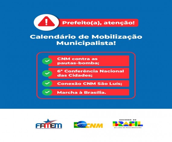 Por fim, a XVII Marcha a Brasília em Defesa dos Municípios, que ocorre entre 18 e 21 de maio, é considerada o maior evento municipalista da América Latina. Tradicionalmente, milhares de participantes se reúnem para discutir questões essenciais ao movimento municipalista. As inscrições já estão abertas, inicialmente, para prefeitos e prefeitas.